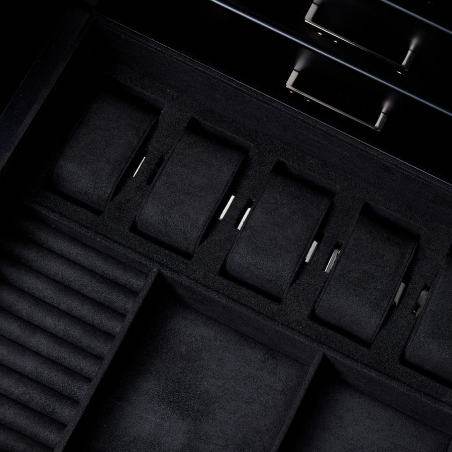 - Additional storage: 3 Lusterloc™ lined, pull-out drawers house 5 additional watches, jewelry and accessory storage. 1 watch drawer, 1 jewelry drawer and 1 open drawer .