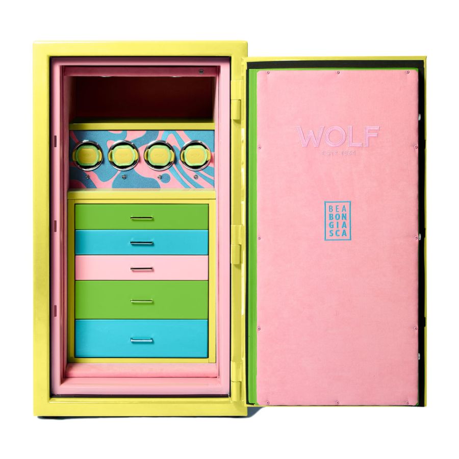 Forged in American steel, UL tested and certified for burglary & fire and available in four striking high gloss exterior colours with iridescent doors, the Bea Bongiasca safe is ar impenetrable fortress. Choose from 4 to 12 watch winders (in groups of 4) controlled by WOLF'S Bluetooth connected app, with corresponding jewellery drawers to house your precious watches, jewellery and accessories.