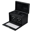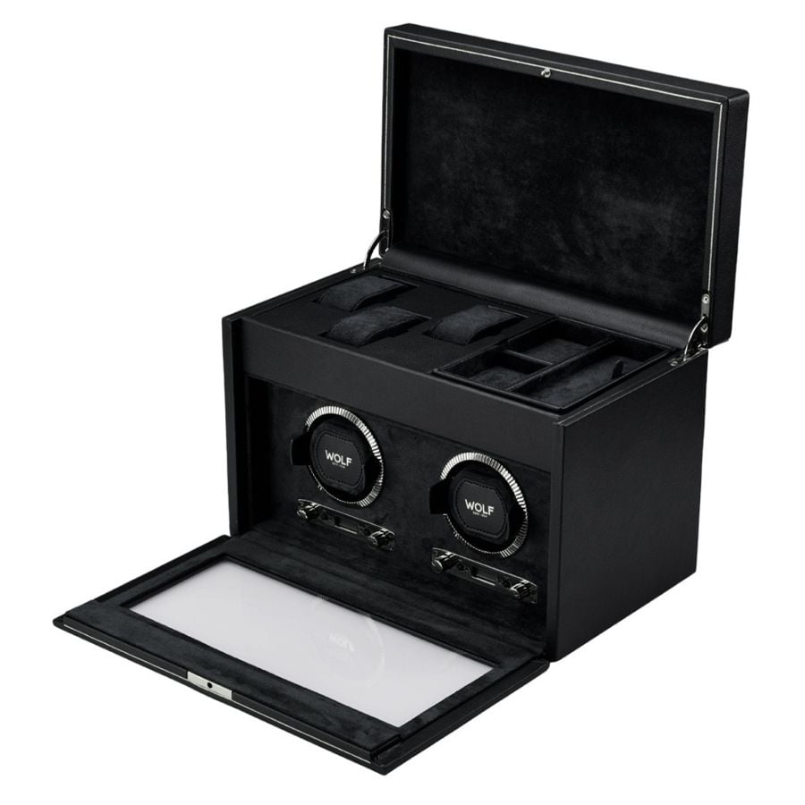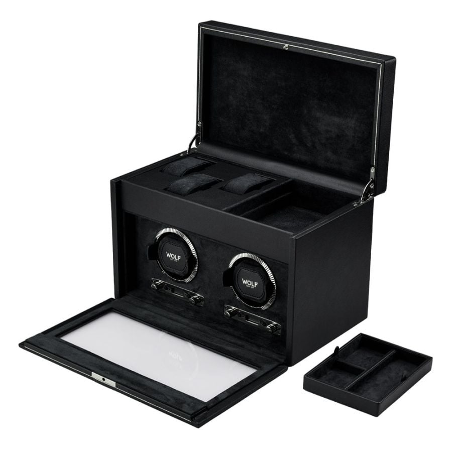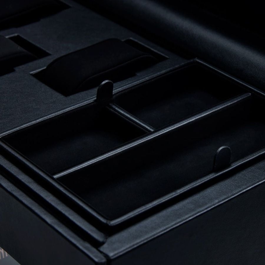 - Storage: 2 winding modules, 2pc watch storage with suspended cushions (cuff will accommodate up to 52mmcase) 1 open compartment, travel case (1pc watch storage, 1 lidded compartment)