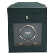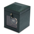 Handmade throughout, British Racing melds the green international motor racing colour of the UK’s cars raced in Ireland in the early 1900’s with a revolutionary quad angled panelled lid. Fine work detailing includes hand-pressed gold foil lines on vegan friendly pebble-grained leather. Gold hardware accents throughout with cushion close hinges and fluted bezel. Another design first from WOLF. Take your watches for a spin in the single watch winder with storage.