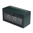 Handmade throughout, British Racing melds the green international motor racing colour of the UK’s cars raced in Ireland in the early 1900’s with a revolutionary quad angled panelled lid. Fine work detailing includes hand-pressed gold foil lines on vegan friendly pebble-grained leather. Gold hardware accents throughout with cushion close hinges and fluted bezel. Another design first from WOLF. Take your watches for a spin in the triple watch winder with storage.