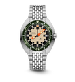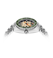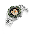 The 42.50-millimeter case of the DOXA Army, machined from a block of 316L stainless steel, is topped with a sapphire crystal. The case, and therefore the movement it protects, is resistant to a pressure of 30 ATM, equivalent to a depth of 300 meters or 984 feet. This reissue model features a unidirectional rotating bezel in bronze – marking the first time ever that DOXA has used this metal in its collections – with a hunter green ceramic insert or in stainless steel with a black or hunter green ceramic insert.
